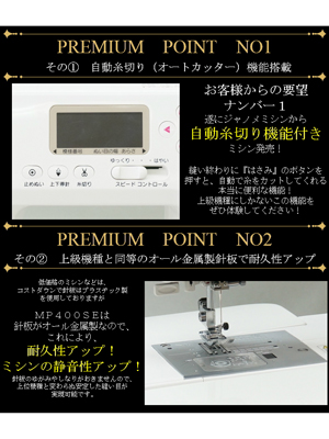 【主な機能】自動糸調子機能、手元LEDライト、押え上げ検知、自動糸通し、7枚送り歯、パワフル貫通力